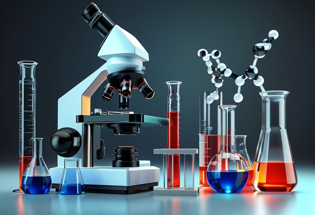 3D插画用于研究和分析的装有化学液体的显微镜和实验室玻璃器皿。用于研究和学生学习的实验室设备。