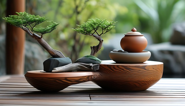 禅意花园中的和谐景象,木与陶器的自然融合。