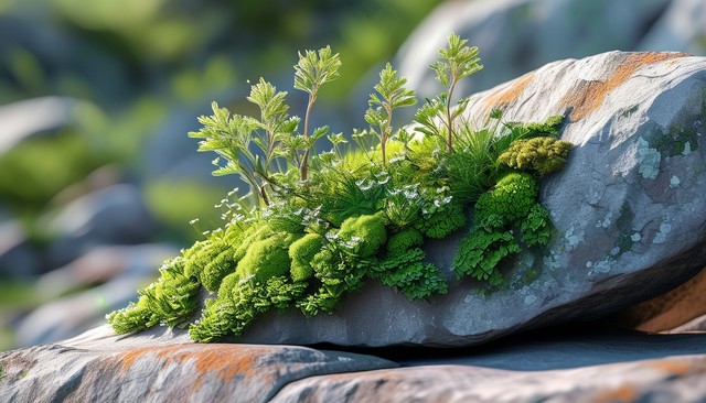 生长在岩石上的绿色地衣插图,自然设计元素
