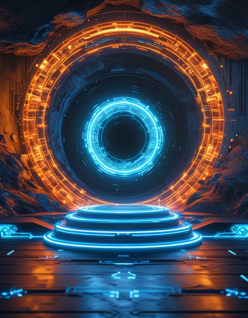光全息图。魔法游戏门户。圆圈技术效果。数字未来平视显示器。科幻太空传送。发光的蓝色讲台。传送隧道。矢