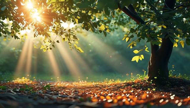在自然环境中,阳光透过树叶洒在地面的美丽景象,展示了大自然的宁静与和谐