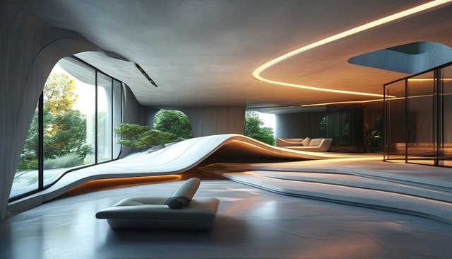 现代感十足的室内空间,流线型结构与自然元素的结合,光影交错,未来主义风格。