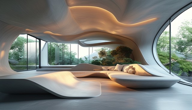 现代感十足的室内空间,流线型结构与自然元素的结合,光影交错,未来主义风格。