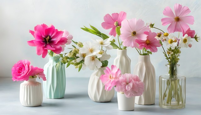 盛放美丽花束的精致陶瓷花瓶,时尚自然,春日气息浓郁。