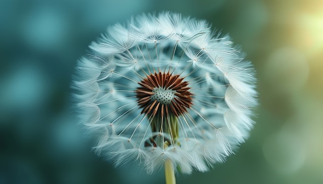 自然光横幅上蒲公英特写,艺术自然特写。春夏背景。梦幻大自然宏观,花卉植物。抽象柔和的蓝绿色季节性野花