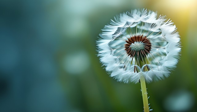 自然光横幅上蒲公英特写,艺术自然特写。春夏背景。梦幻大自然宏观,花卉植物。抽象柔和的蓝绿色季节性野花