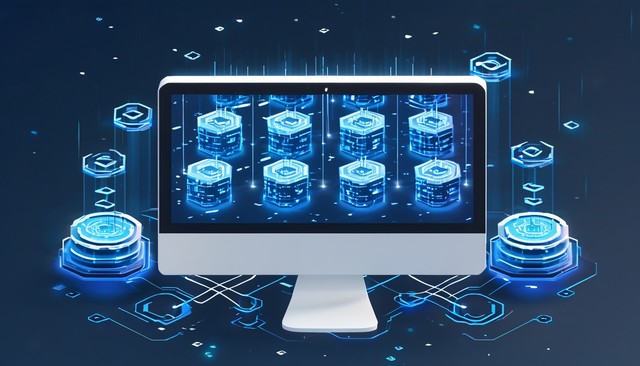 计算机显示器屏幕上的抽象数字等距区块链图标。链接块技术或元宇宙概念。未来低多边形线框图风格蓝色背景上