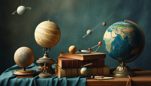 书籍、文具和一个行星模型的静物摆放,展现知识与创意的氛围。
