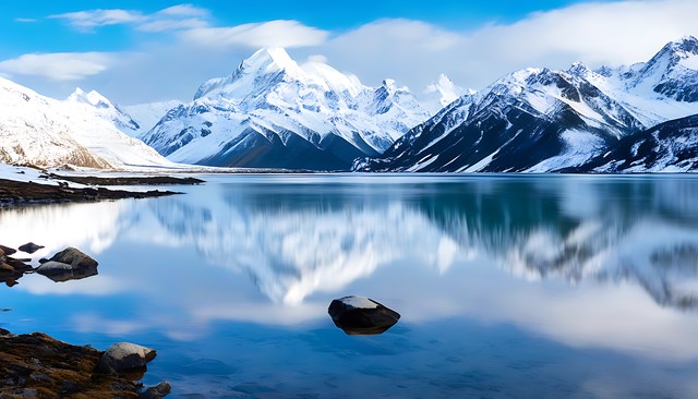 宁静雪山下的自然美景,雪帽山峰与蔚蓝天空交相辉映。