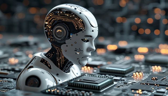 人工智能技术。电路板上数字手中的处理器。人工智能