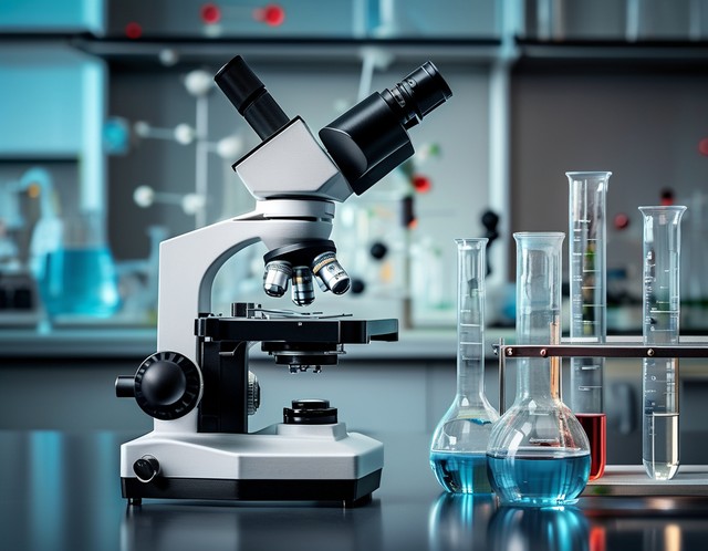 在实验室中使用显微镜进行实验和分析,研究生物学、医学和技术的尖端科学仪器