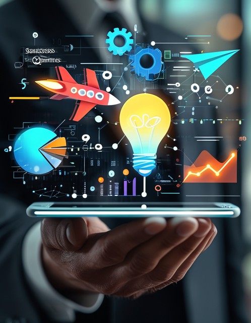 现代商业智能技术的概念创新、灵感、创造性解决方案理念。成功的创造力发明,思维想象力数字营销在线。手持
