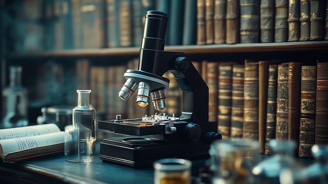 显微镜下的样品透过射线照相术展示出独特的结构,背景为科研专业书籍。