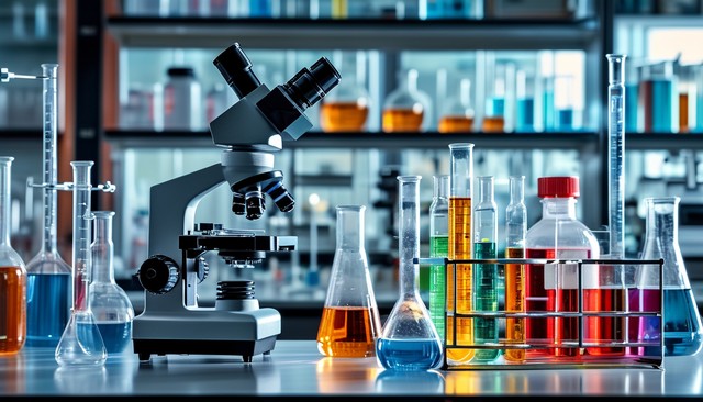 实验室内的显微镜与各类化学试剂瓶,展现科研氛围。