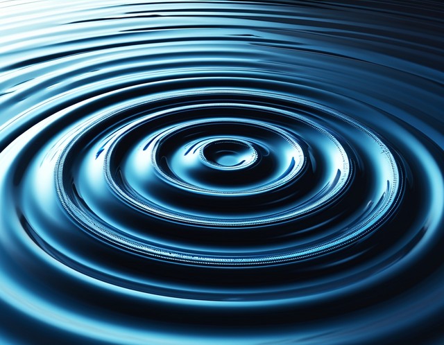 蓝色表面上的同心无线电波。波浪在水面上发散。横幅、网页、印刷品、海报、名片和模板的半色调设计。矢量
