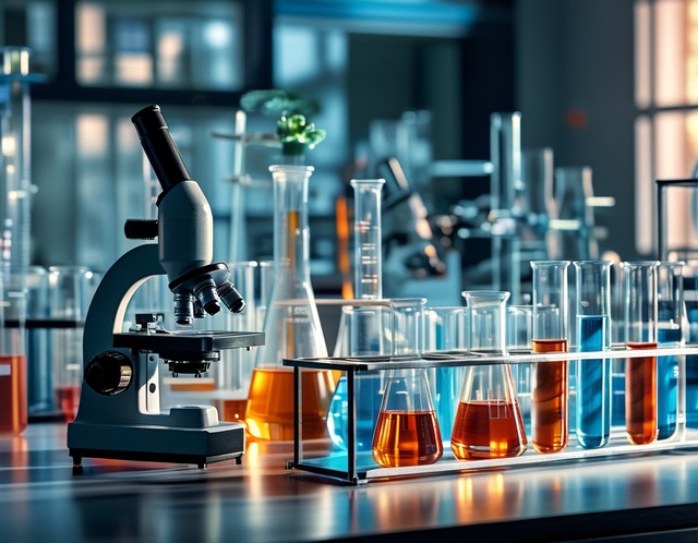 显微镜与试管的实验室场景,展示科研氛围。