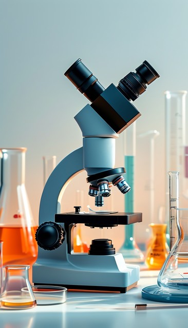 桌上放着一台显微镜的插图,还有一些实验用的玻璃器皿
