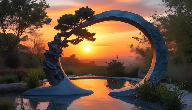 浪漫花园中的日落景象,融合雕塑与自然元素的美感。