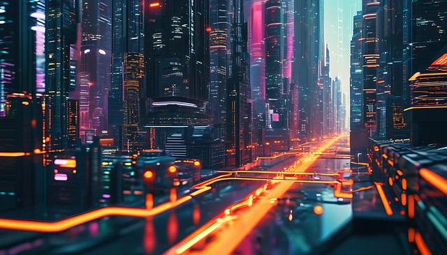 高科技背景下的赛博朋克城市芯片渲染图,展现人工智能与数字技术的融合之美。
