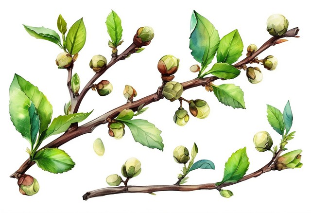 有芽和嫩叶的树枝。水彩插图孤立在白色背景。设计和印刷的春季和自然概念。贺卡和请柬的植物元素