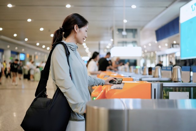 使用非接触式支付技术在机场旋转栅门的现代旅行者