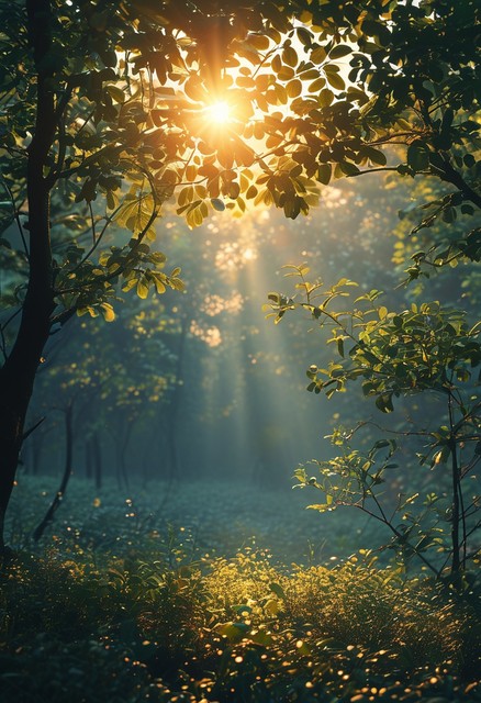 清晨阳光透过森林树叶描绘自然宁静与美丽的景象