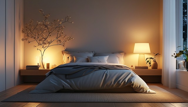 温馨的卧室环境,巧妙运用柔和灯光与自然元素,营造出宁静的夜晚氛围。