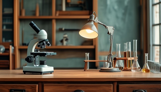 复古实验室内部木桌上摆着显微镜和台灯