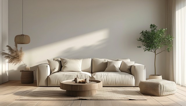 简约舒适的客厅设计,带有自然元素的装饰与柔和的光线。