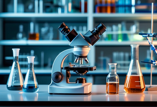 显微镜与实验室背景的对比,展现现代科技对科学研究的推动。