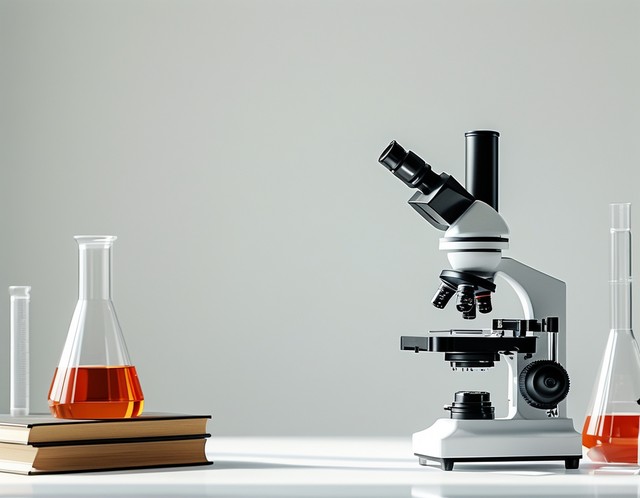 实验室显微镜和书籍孤立在白色。有文本的自由空间。拼贴。