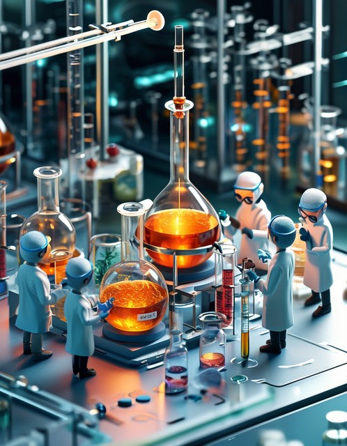 3D插画一群专门的科学家在医学实验室进行化学实验和研究,作为疫苗药物或抗生素的开创性开发。制药和生物
