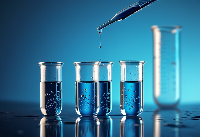 带有蓝色液态水样品的试管和蓝色背景上的移液管。移液管将样品滴入试管。实验室玻璃器皿,科学实验室研究概