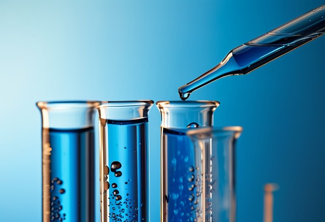 带有蓝色液态水样品的试管和蓝色背景上的移液管。移液管将样品滴入试管。实验室玻璃器皿,科学实验室研究概