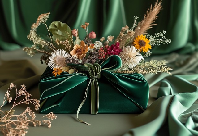 精美的手工包裹,搭配干花和自然元素,创意的绿色丝绒布料与装饰,展现出独特的生活美学。