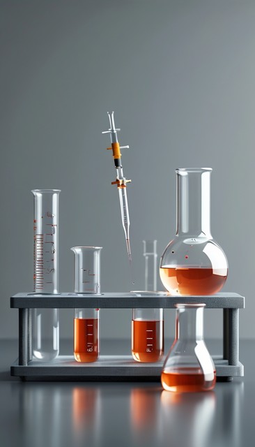 实验室分析。灰色桌子上的微量移液器、烧杯、烧瓶、培养皿和试管