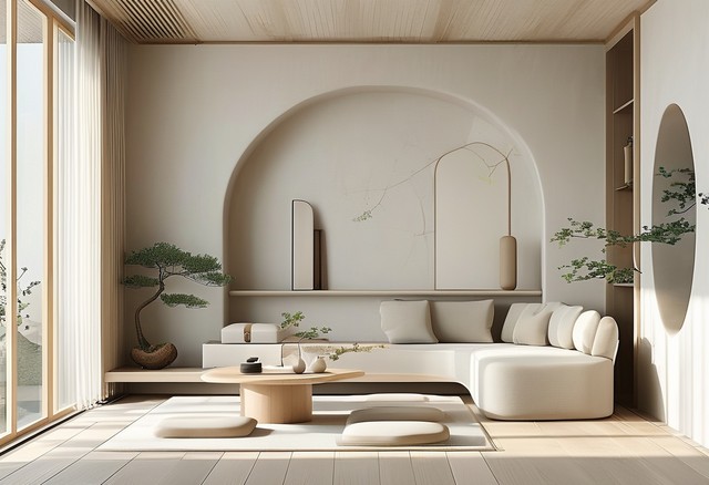 简约现代的室内设计,浅色调和自然元素结合,营造宁静舒适的氛围。