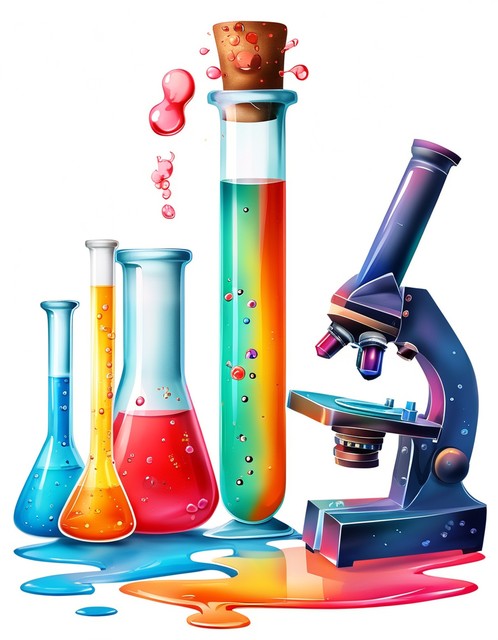带有彩色液体和显微镜的试管隔离在白色