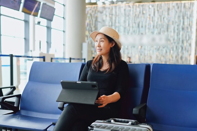 带着笔记本电脑和行李箱在机场休息室工作的商务旅客