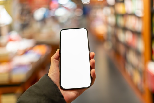 在舒适的书店环境中手持空白智能手机