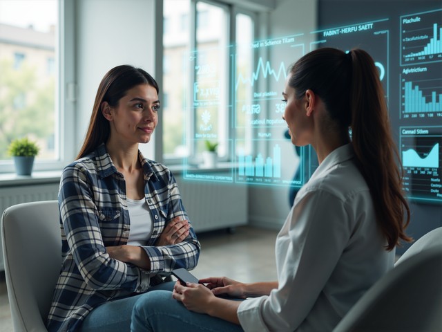 两位女士在讨论数据可视化信息其中一位手持