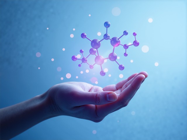掌心悬浮的分子结构象征着科学与人类的联系