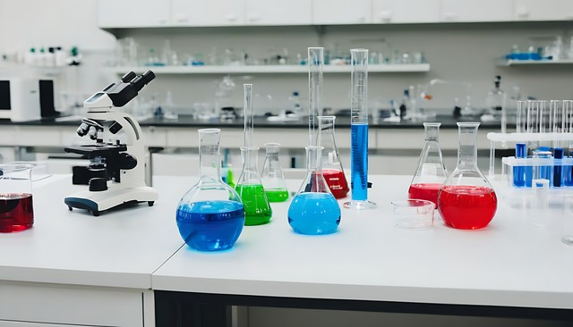 实验室内的精密研究环境,展示多样的实验器材与化学反应