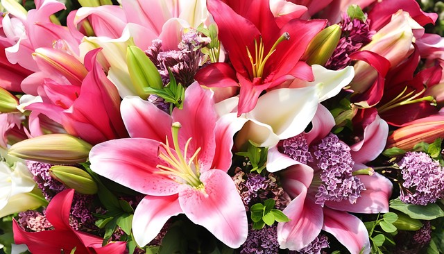 浪漫花园中的百合花束,搭配丰富的自然元素和绚烂色彩。