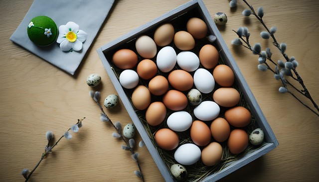 托盘中的鸡蛋与自然元素结合的艺术美感