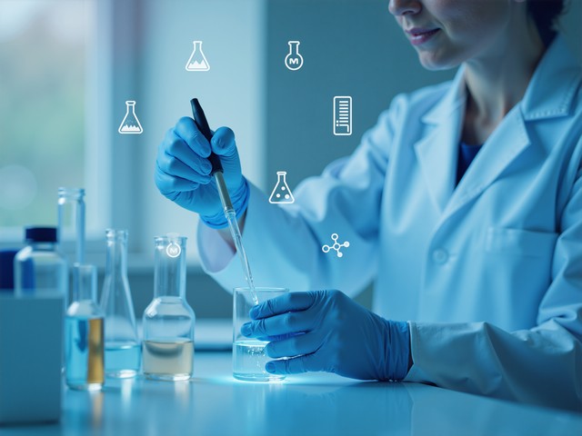 【AIGC】在进行科学实验一名穿着白大褂和蓝色手套的