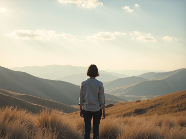 【AIGC】大自然中的孤独身影黄昏山间散步宁静自然的