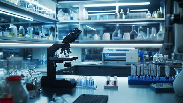 一个配备先进设备的现代实验室,展示了科学的精确和创新。