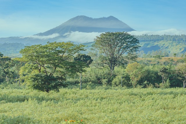 印度尼西亚东爪哇晴朗的清晨,云雾环绕在伊真高原的伊真火山山腰