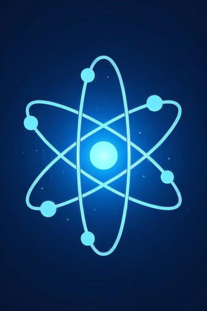 深色背景蓝色霓虹灯原子符号特写高清图片